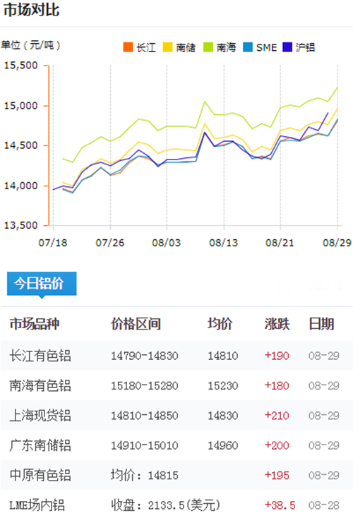鋁錠價(jià)格今日鋁價(jià)2018-8-29