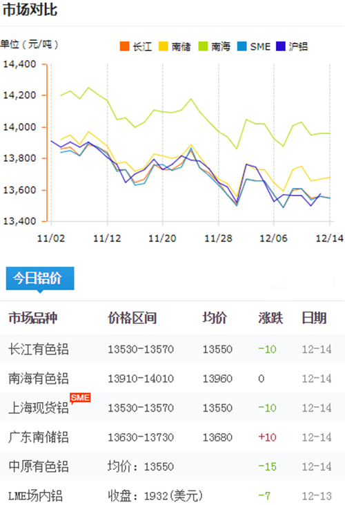 鋁錠價(jià)格今日鋁價(jià)2018-12-14