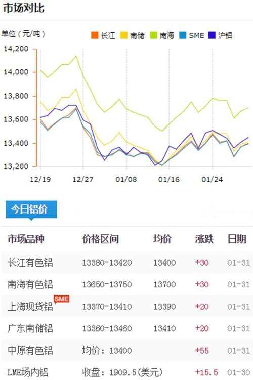 鋁錠價格今日鋁價2019-01-31