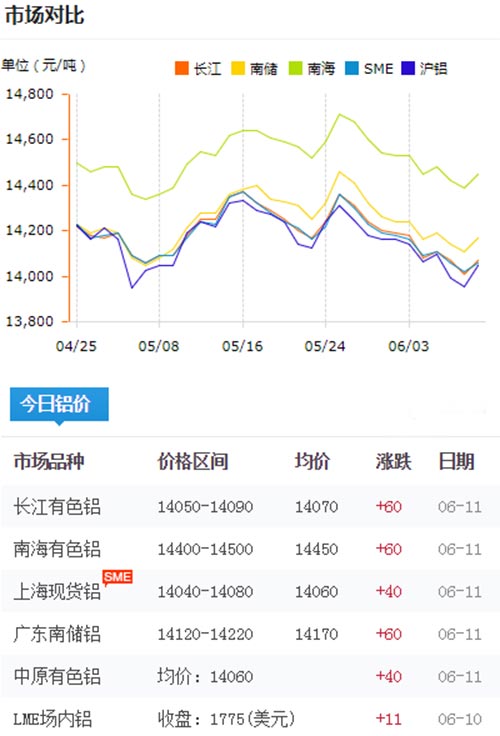 鋁錠價格今日鋁價2019-06-11