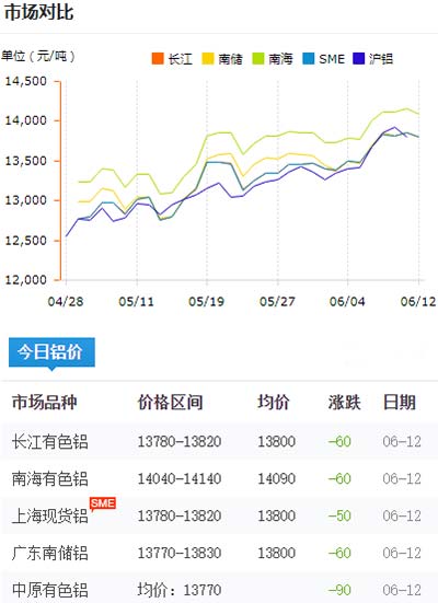 鋁錠價(jià)格今日鋁價(jià)2020-06-12
