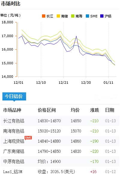 鋁錠價(jià)格今日鋁價(jià)2021-01-13